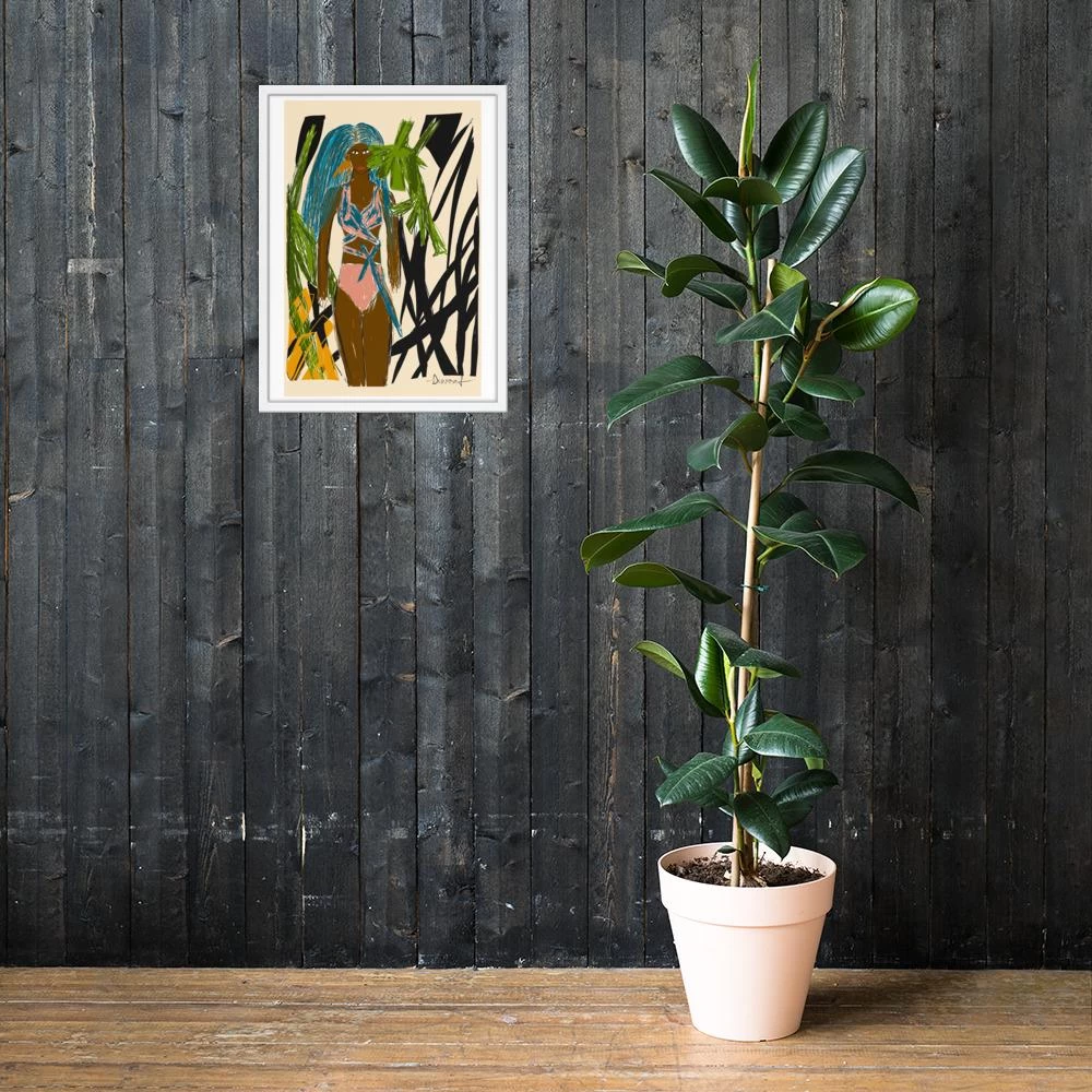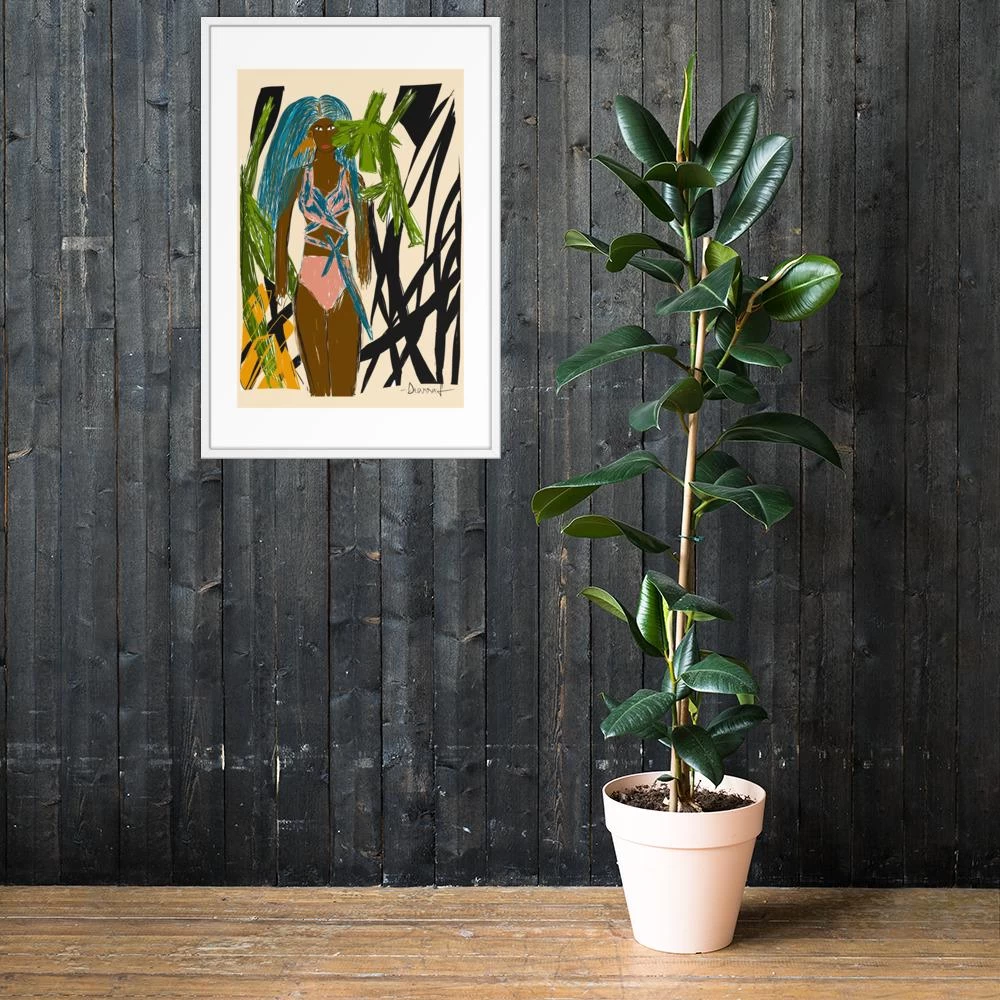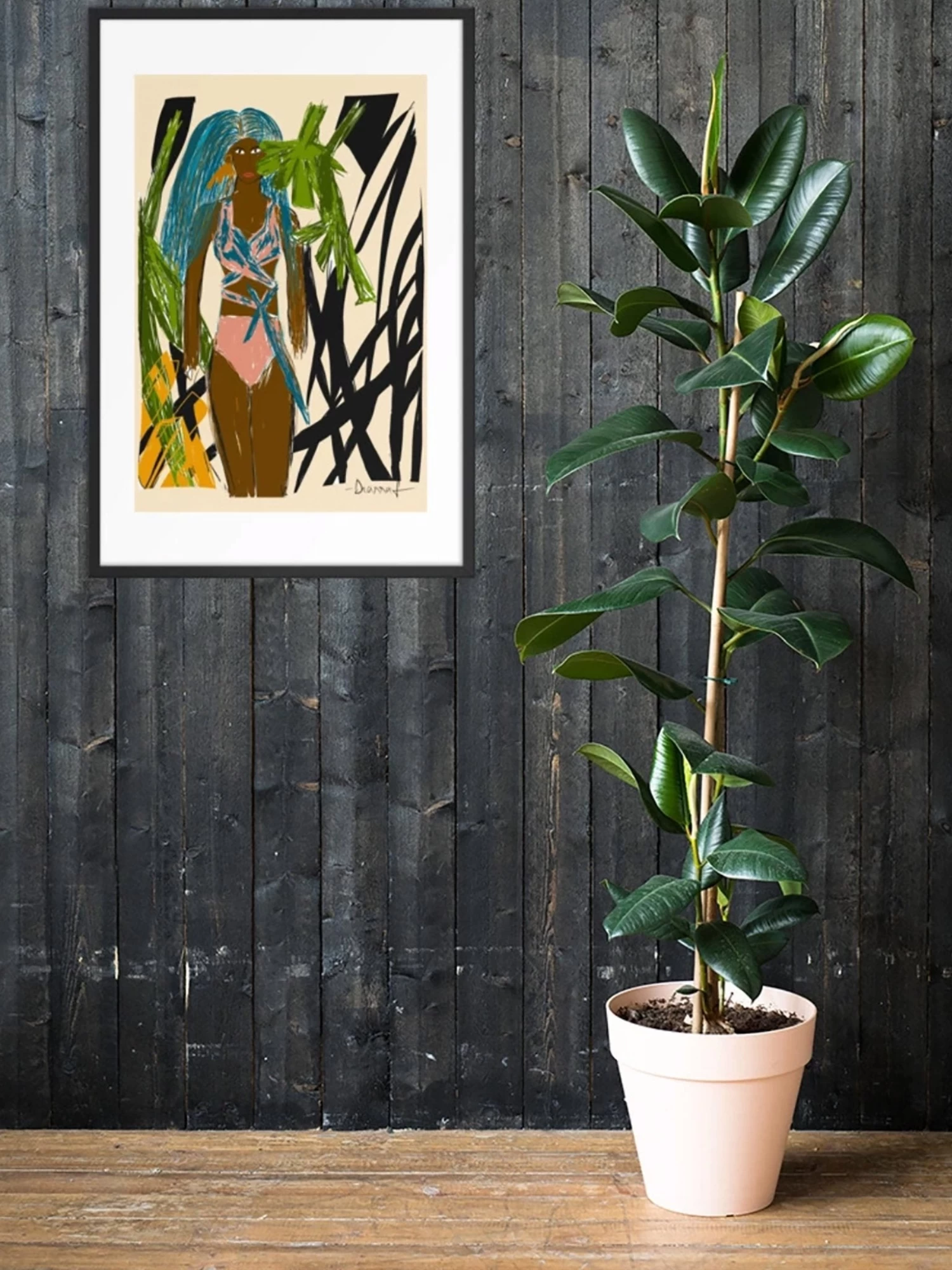 Jigeen: Wolof for woman, this piece explores the daydream of a free-spirited muse with blue hair lost on a secluded beach in Bali, Indonesia. She is imagined in bold traditional statement earrings as she wears her culture fearlessly.
