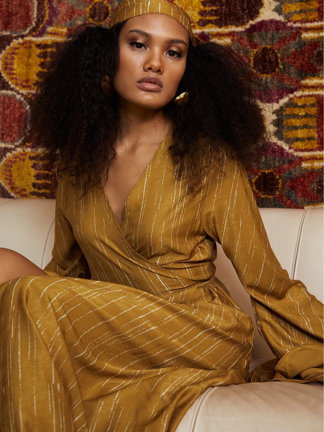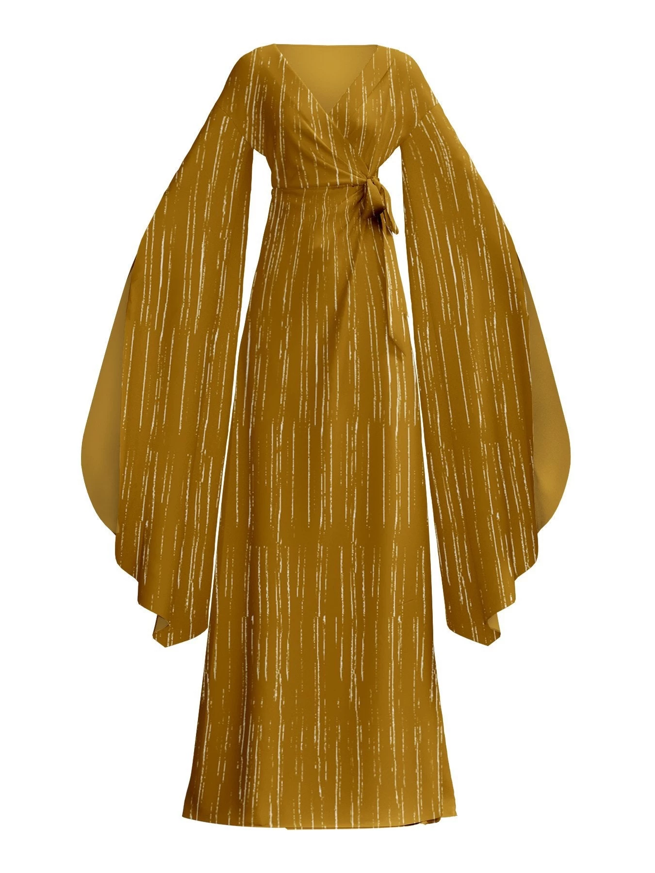Elegant maxi wrap dress with exaggerated sleeves.