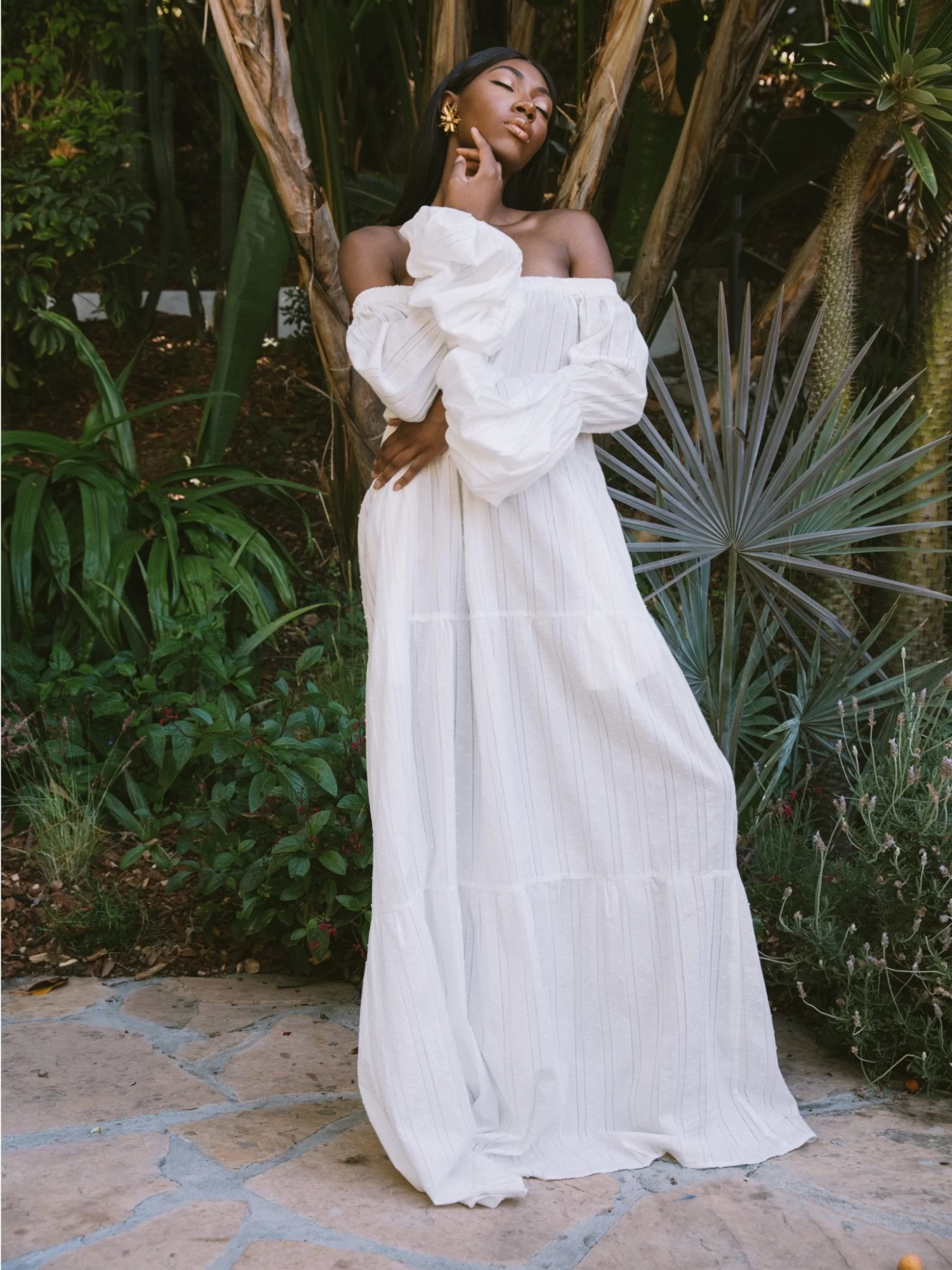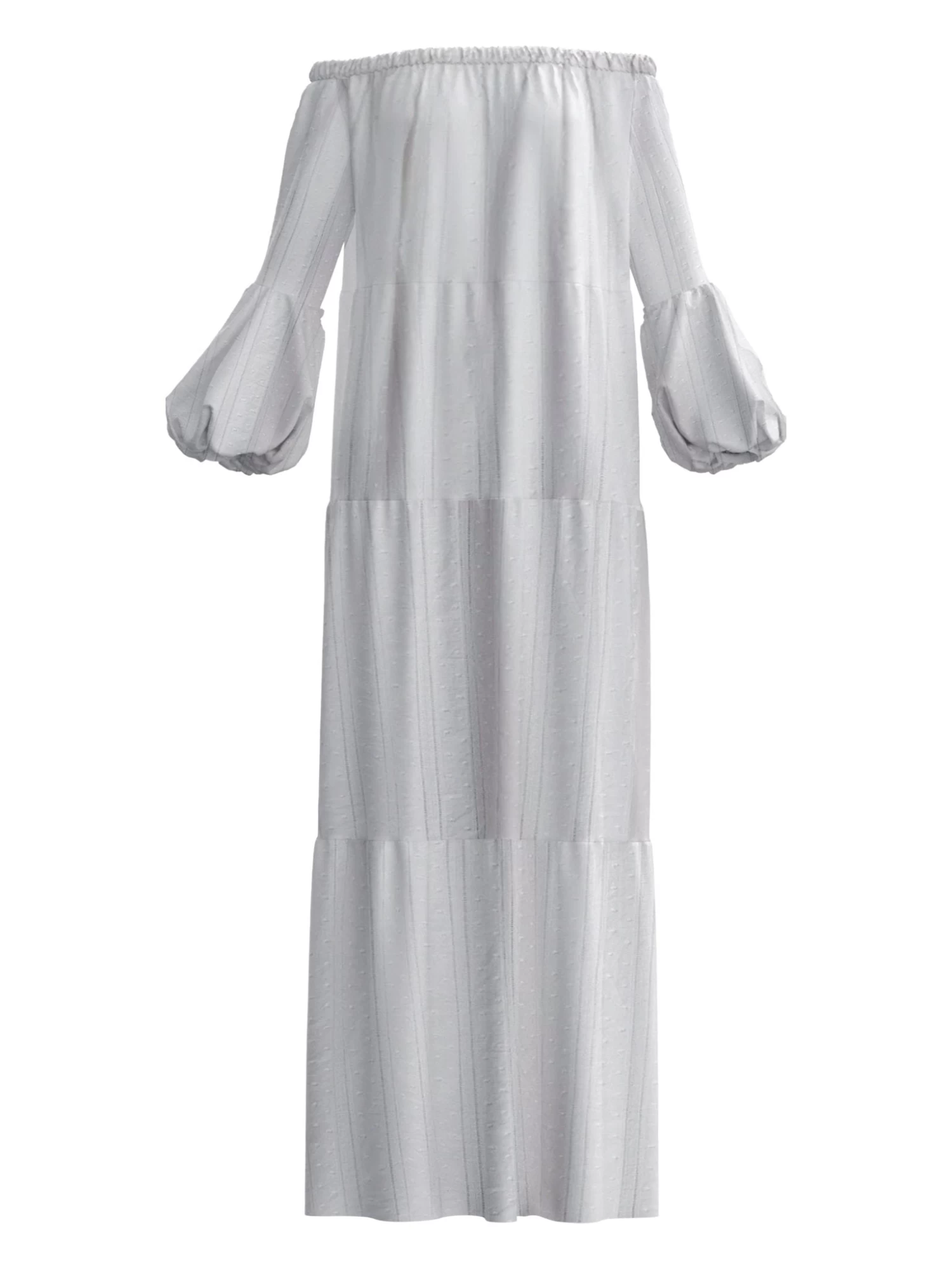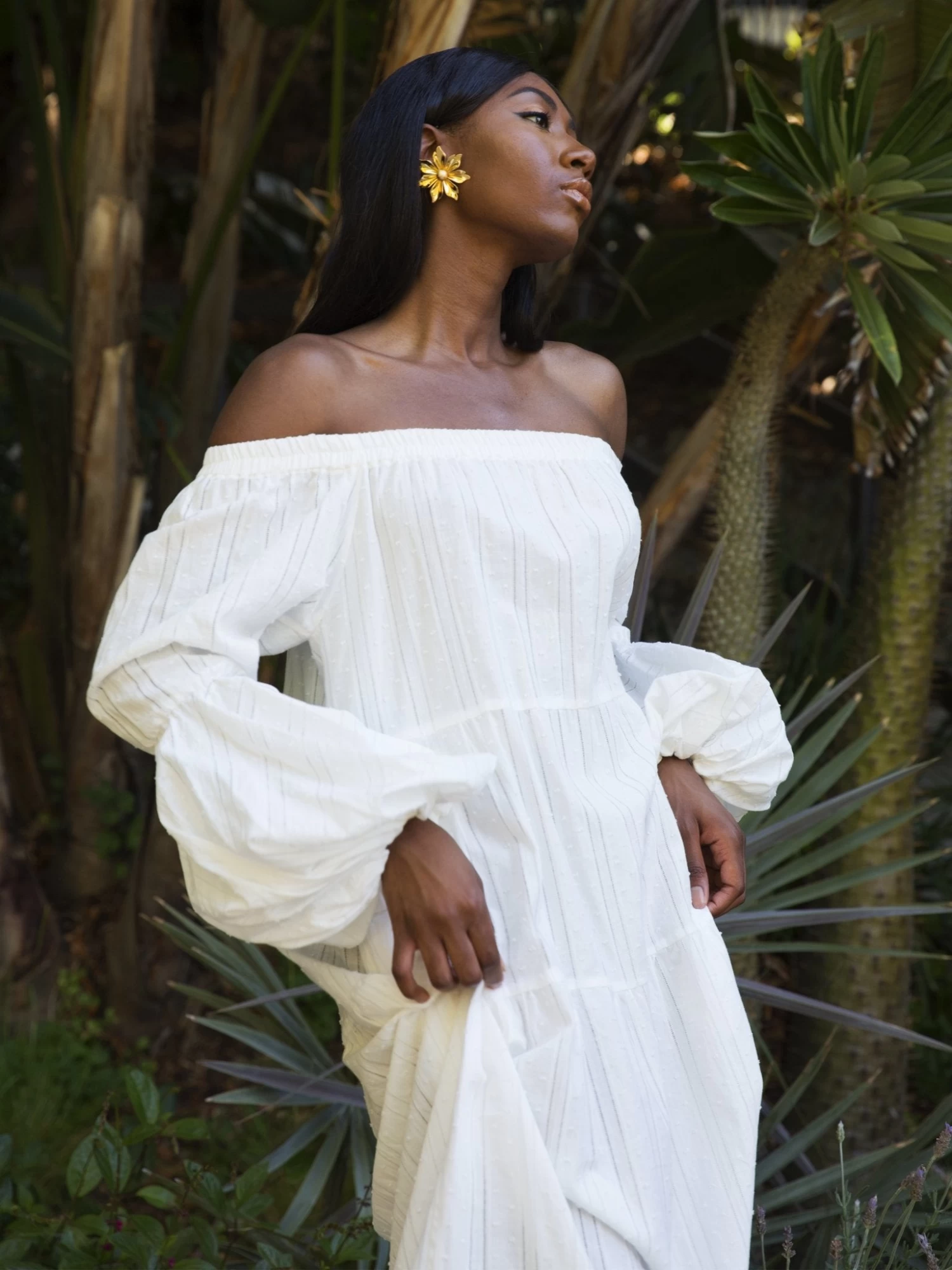 The Kudi dress is an effortless off-the-shoulder silhouette made from tiers of sustainable fabric.