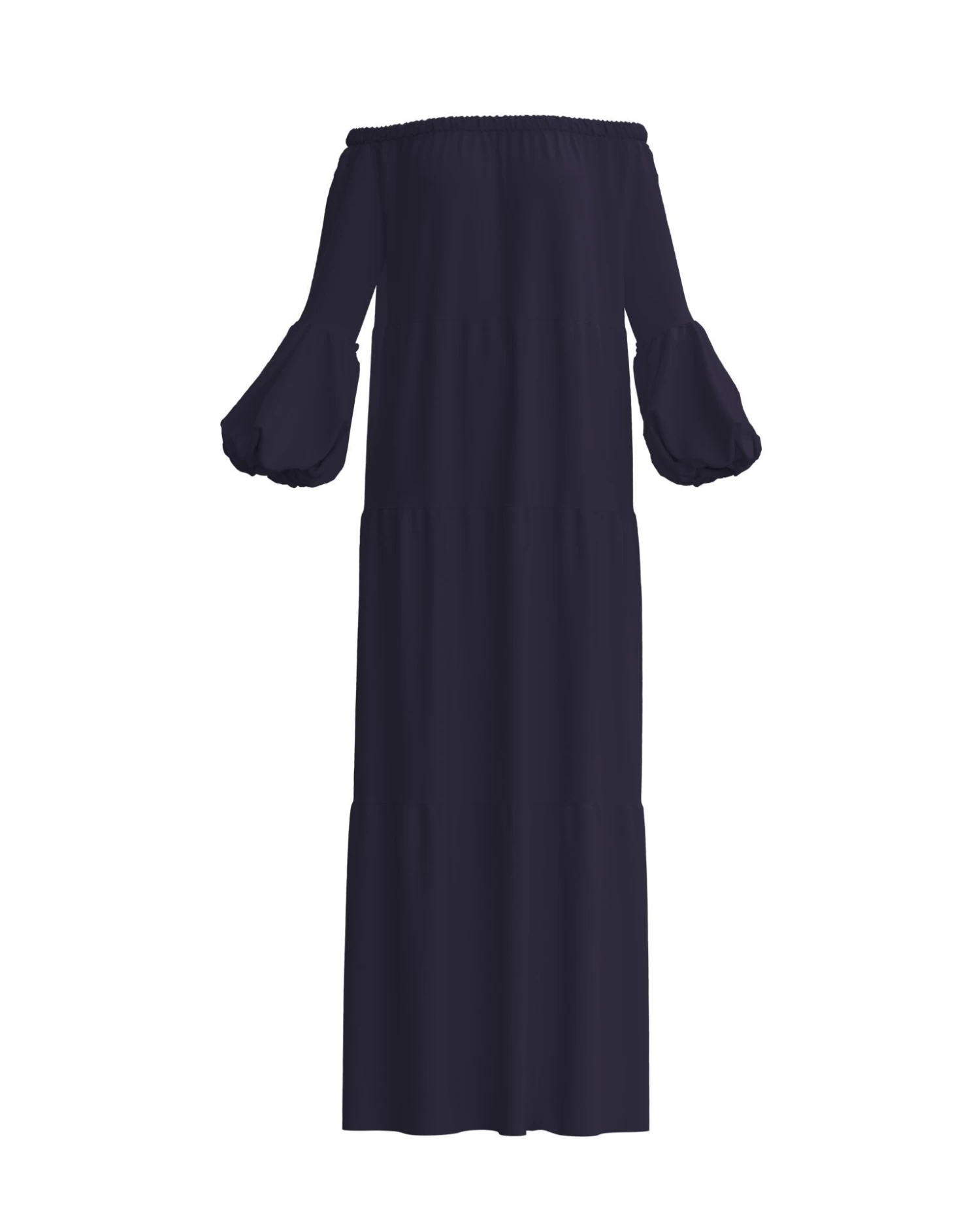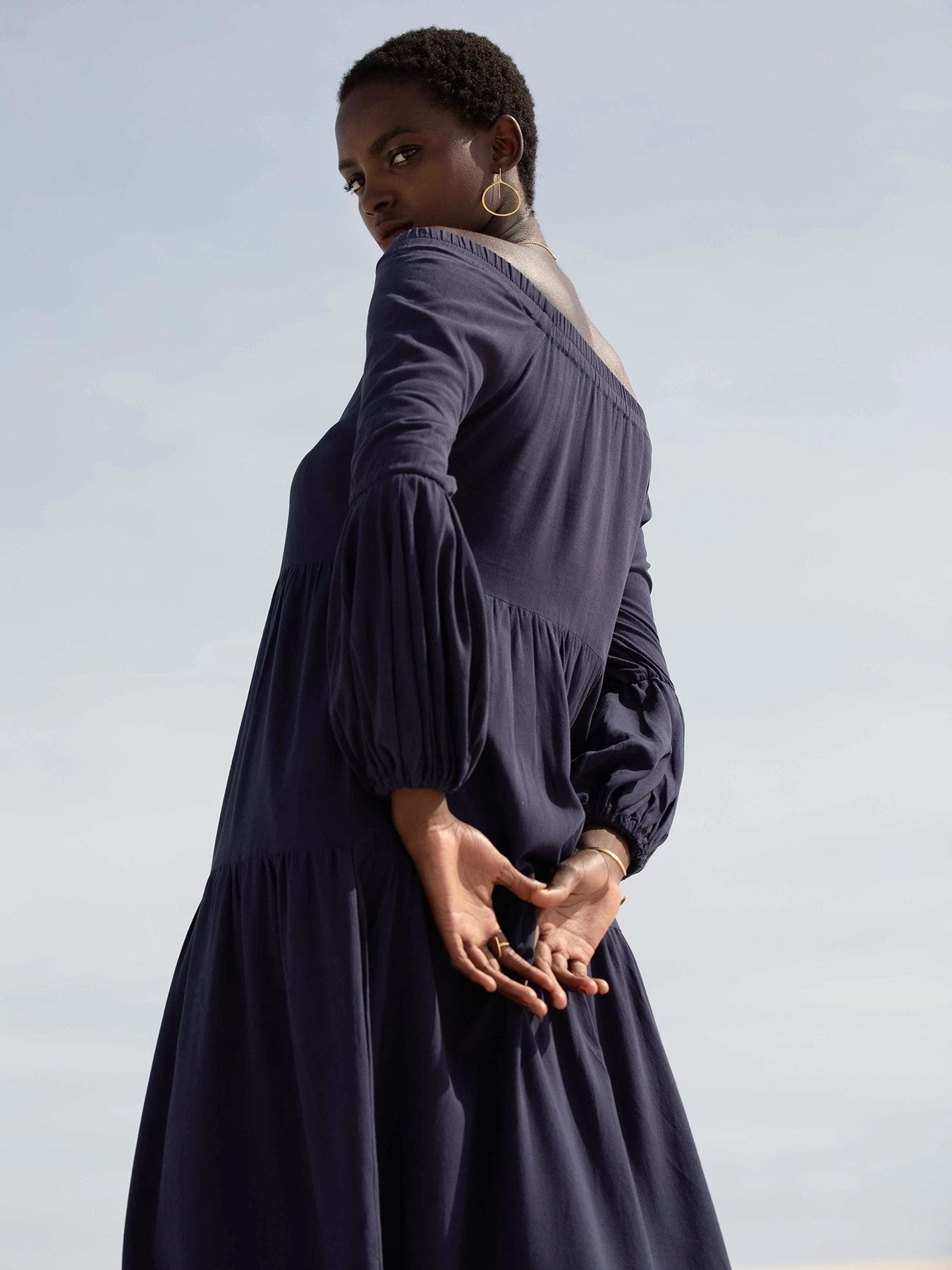 The Kudi dress is an effortless off-the-shoulder silhouette made from tiers of sustainable fabric.